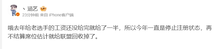 哦去年給老選手的工資還沒給完就給了一半,所以今年一直是停止注冊狀態(tài),再不結算席位估計就給聯盟回收掉了。