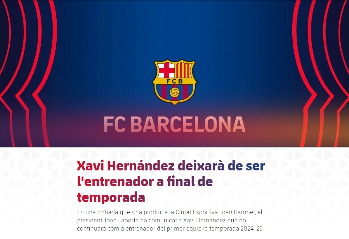 巴薩官方第一時間官宣這一消息時,只用了“官方公告”作為公告標題,但不久后俱樂部又更改了公告標題,新的標題很直接地寫道:“哈維本賽季結(jié)束后將不再擔(dān)任主教練?!?/p>