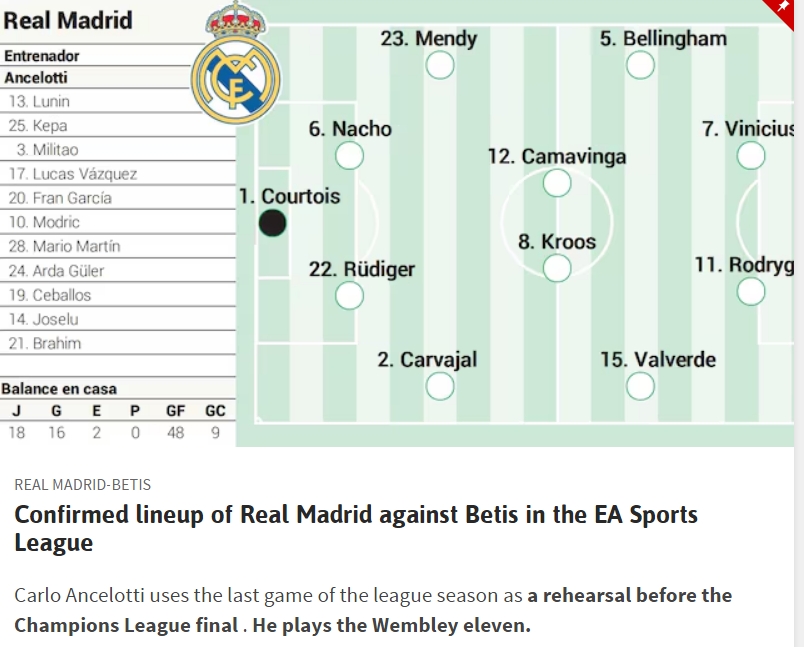 5月26日報道 西甲收官戰(zhàn),皇馬主場迎戰(zhàn)貝蒂斯。據(jù)西班牙媒體《阿斯報》報道,安切洛蒂將此役作為歐冠決賽的練兵預演,他將在歐冠決賽排出與本場相同的首發(fā)陣容。