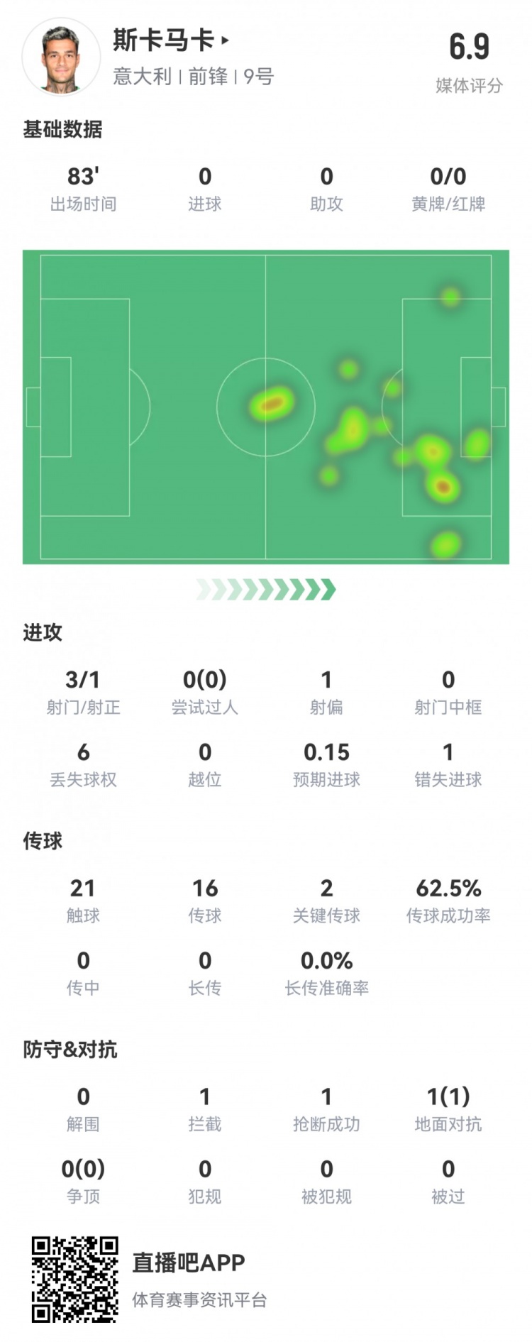 6月16日?qǐng)?bào)道 正在進(jìn)行的歐洲杯小組賽首輪,意大利暫2-1領(lǐng)先阿爾巴尼亞。此役斯卡馬卡首發(fā)出場(chǎng)83分鐘被換下,球員全場(chǎng)重點(diǎn)數(shù)據(jù)如下↓