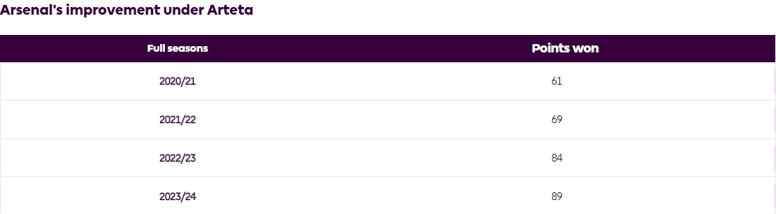 阿爾特塔接手阿森納4個(gè)完整賽季積分↓