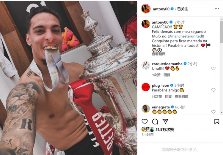 此役未出場的安東尼在社交媒體上曬出自己與獎杯的合照,并寫道:“冠軍!很高興贏得我在曼聯(lián)的第二個冠軍!載入史冊的成就!祝賀所有人!”