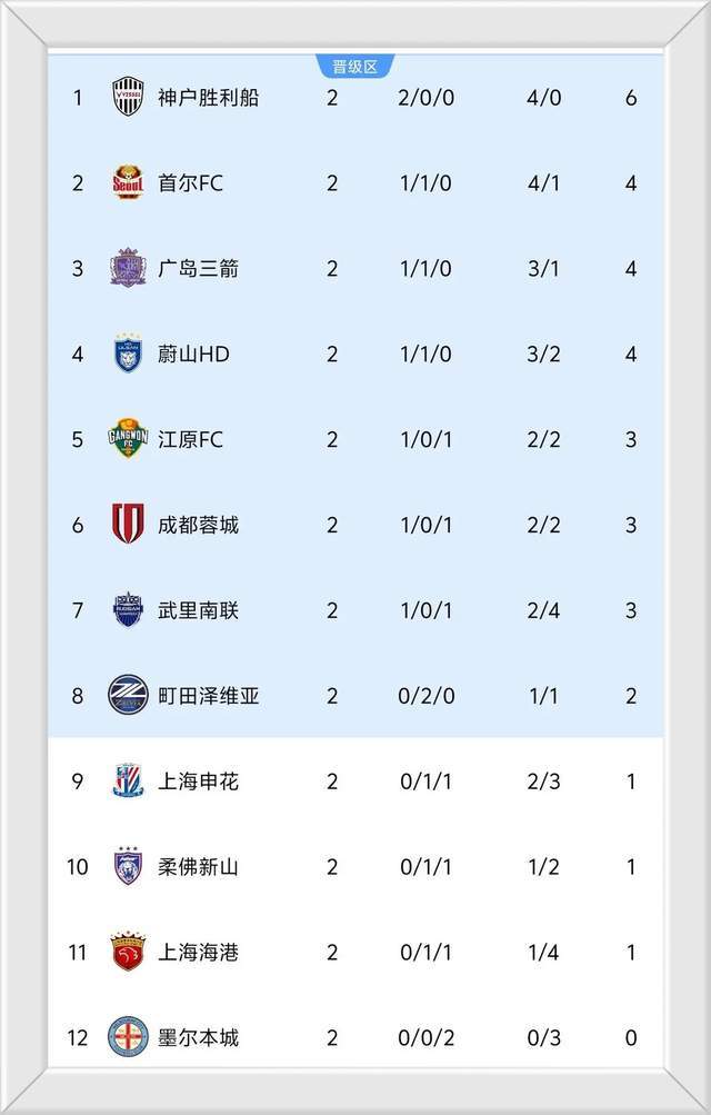 神戶勝利船以2戰(zhàn)全勝積6分躍居榜首,兩連敗的墨爾本城0分墊底。