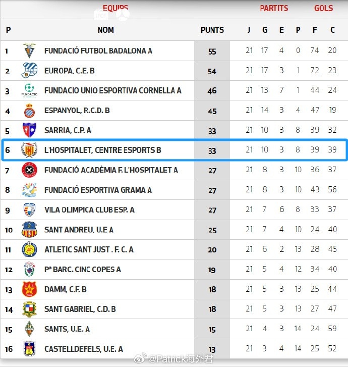 奧斯皮塔萊特中心體育U16B隊征戰(zhàn)加泰羅尼亞自治區(qū)U16優(yōu)選聯(lián)賽(2)第2組,目前10勝3平8負、積33分排名小組第6位。